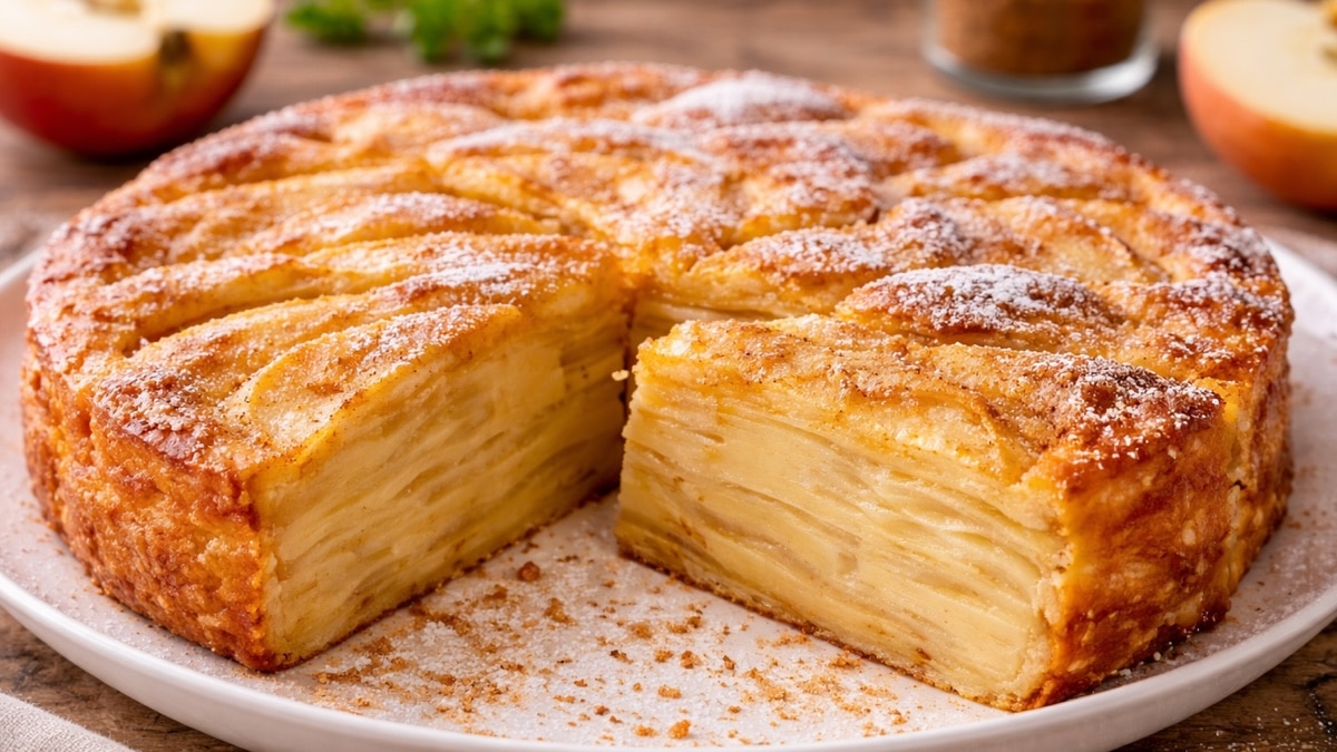 Le gâteau invisible aux pommes fait partie de ces desserts qui intriguent dès le premier regard. À la découpe, on voit surtout des couches fines de pommes, presque fondues dans une pâte légère, comme si le gâteau s’était construit tout seul autour du fruit. C’est d’ailleurs ce qui fait son charme. Il donne l’impression d’un dessert plus travaillé qu’il ne l’est vraiment, alors qu’il repose sur une préparation très simple et des ingrédients du quotidien.